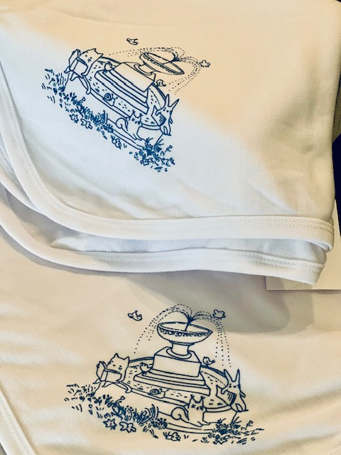 These adorable baby blankets are a pure white poly with a corner flourish depicting critters lounging at Ridgefield's iconic Cass Gilbert Fountain. Moisture wicking fabric.