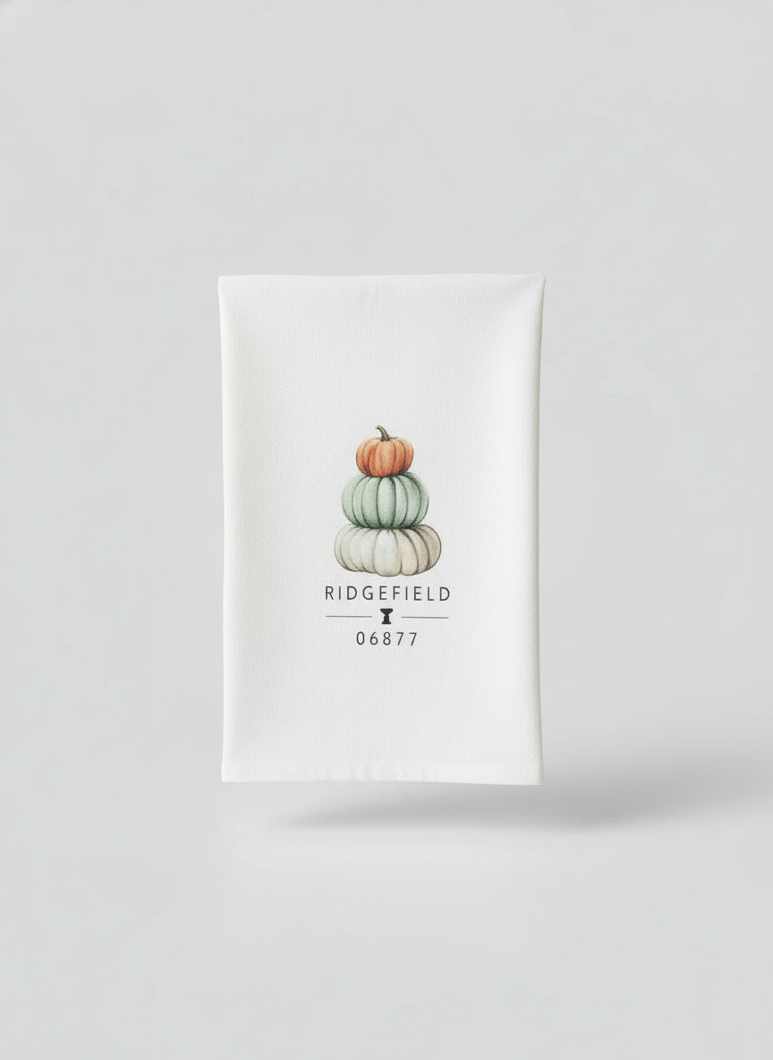 Show your love for Ridgefield and its annual "The Pumpkin Weigh Off" with this adorable tea towel. It's eco-friendly, highly absorbent, 100% cotton and a VERY generous 27" x 27" in size. Cream with black lettering.