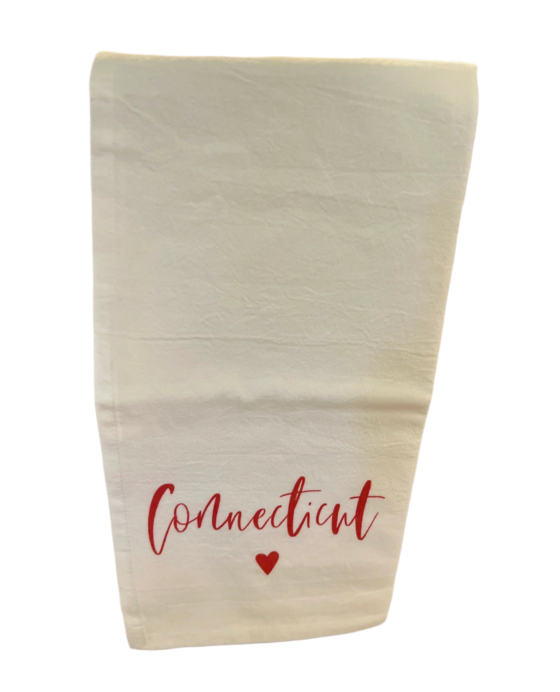 Show your love for CT with this adorable tea towel. This eco-friendly, highly absorbent towel is 100% cotton and a VERY generous 27" x 27.5" in size. White with red lettering.