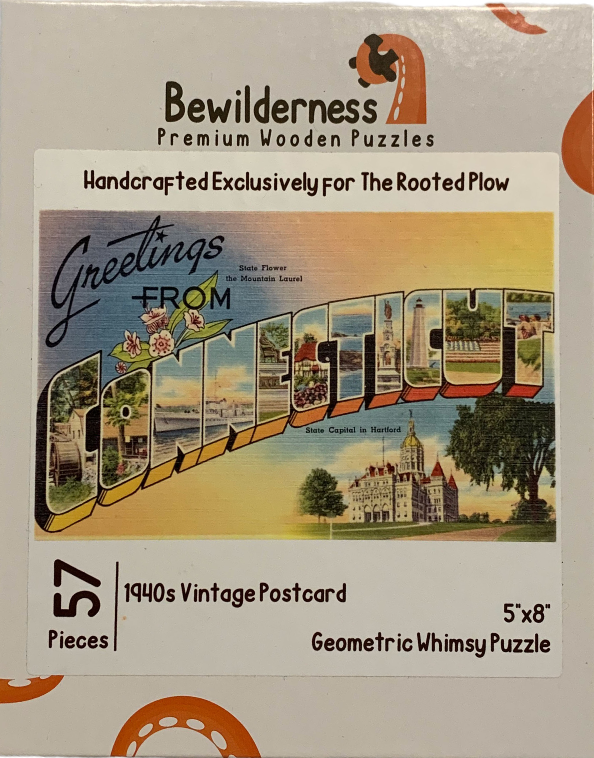 Handcrafted exclusively for The Rooted Plow in Washington State by a quartet of passionate female puzzlers, this premium 100% wood puzzle is sure to confound and delight!! Our "Greetings from Connecticut" design originated on a vintage 1940s postcard. As you work this 5" x 8" postcard size puzzle, look for the special "whimsy pieces" which reflect symbols of The Nutmeg State. These heirloom quality puzzles are designed to entertain for years and make for a truly special gift.