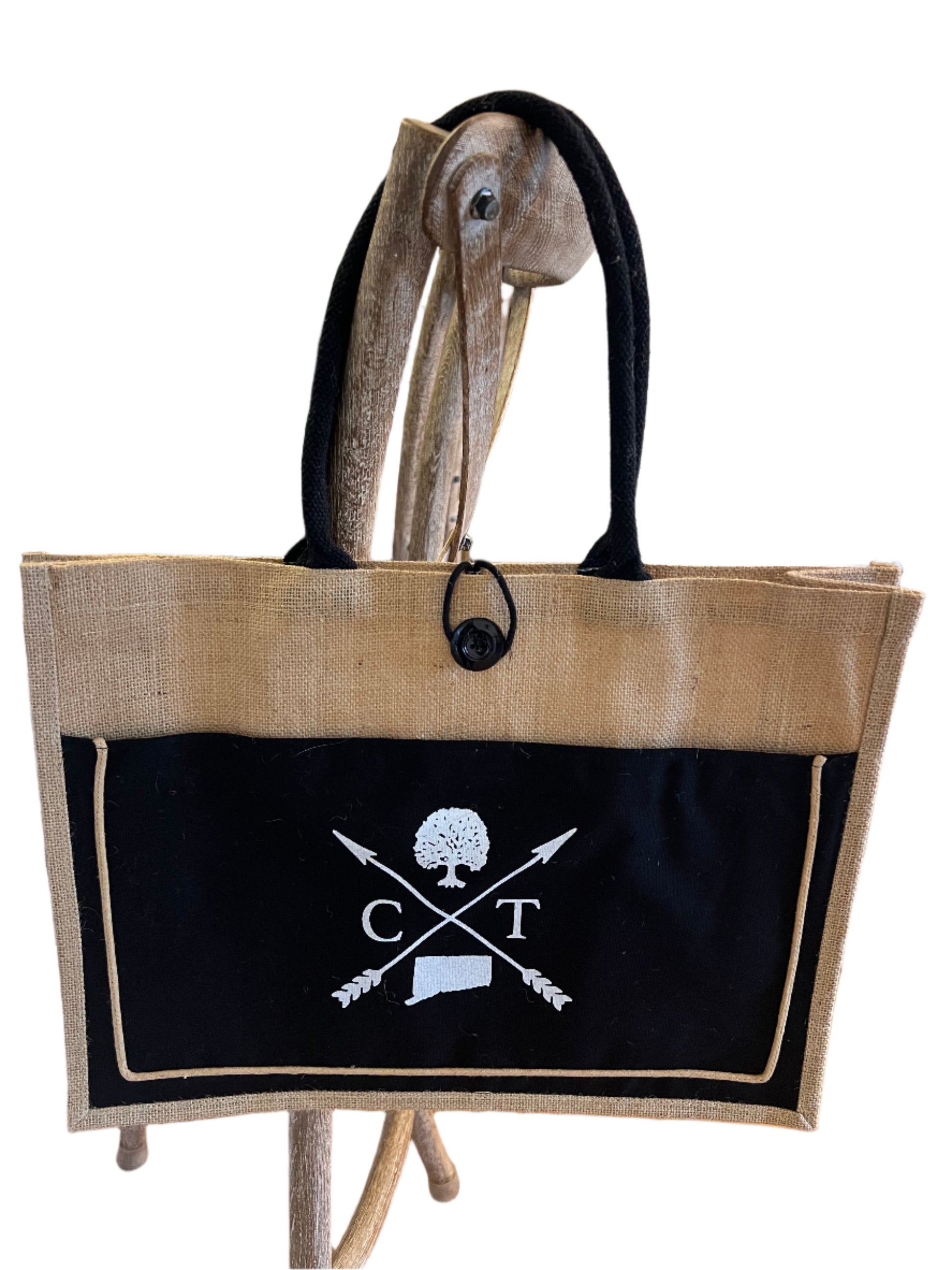 These extra-large jute totes, in our Iconic Connecticut design, have a canvas front pouch with velcro closure. They're biodegradable, come with a waterproof lining, and are strong and long-lasting. Black with with white trim. Spot clean.