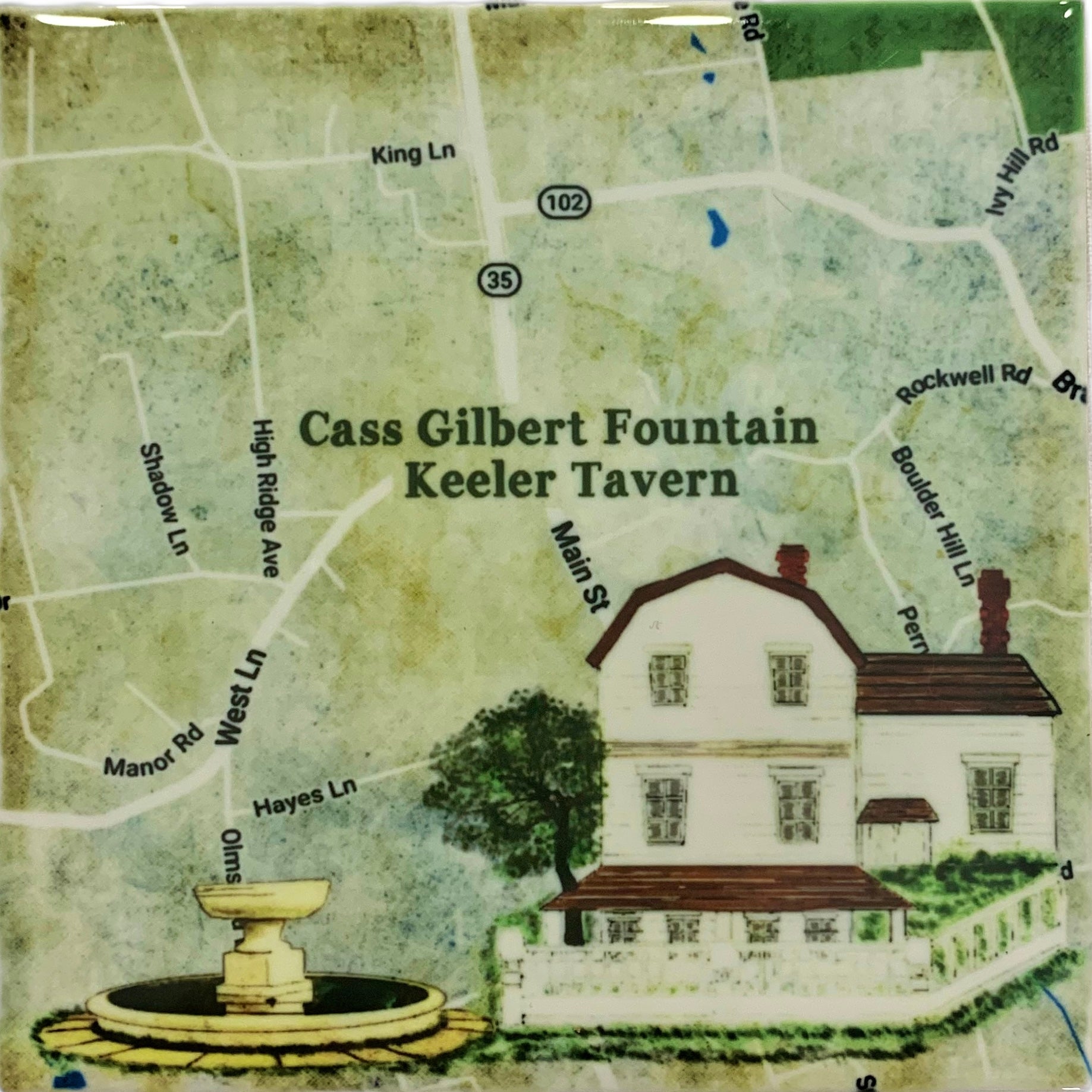 We've collaborated with a New Hampshire-based artist in creating these fantastic art tile coasters. Our Ridgefield version depicts the town's iconic Cass Gilbert fountain and Keeler Tavern. They are 4.25” x 4.25” in size with a glossy finish and cork back. Sold in sets of 2. A Rooted Plow exclusive.